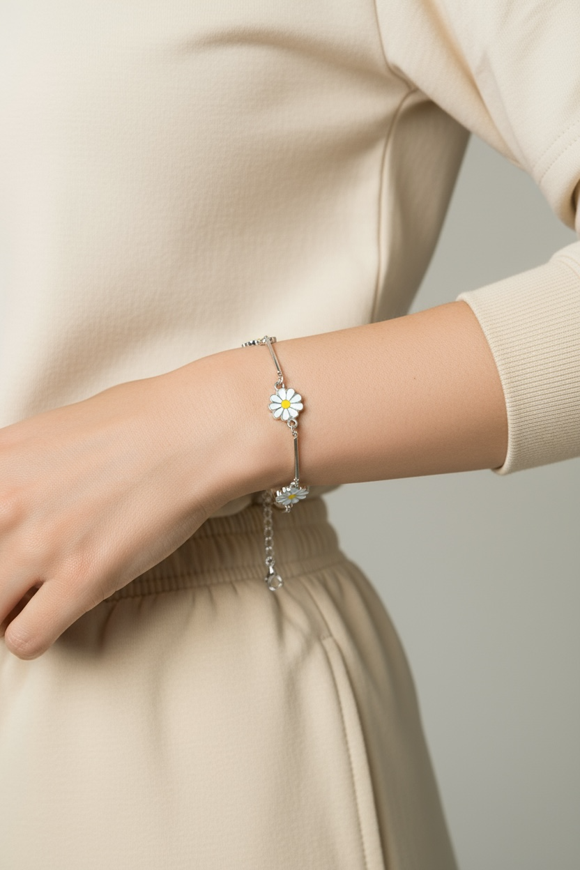 Zarif papatya figürleri ile süslenmiş , gümüş renkli kaplaması ile dikkat çeken bu bileklik, şıklığınızı tamamlayacak bir aksesuar; ; Gümüş rengi sayesinde her türlü kıyafetle kolayca uyum sağlar ve günlük kullanım için idealdir; Özel günlerde veya günlük kullanımda tercih edebileceğiniz bu bileklik, zarafetiyle dikkat çeker. Ürün temizliğini pamuklu bir bez ile yapabilirsiniz . ; Kimyasal maddelerle teması olmaması dahilinde kararma yapmaz . ; Anti Alerjiktir ciltde herhangi bir kızarıklık vb. olumsuz etki oluşturmaz . ; İş günleri 24 saat içinde kargoda .