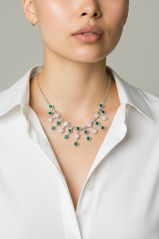 Zamak kaplama malzemesi sayesinde uzun ömürlü ve dayanıklı kullanım sunar; gümüş rengi kaplama ve yuvarlak yeşil taş detayları ile şık ve göz alıcı bir görünüm kazandırır; tasarımı ile modern ve estetik bir stil ifade eder; Gerdanlık formu, boynunuza zarif bir dokunuş ekler
